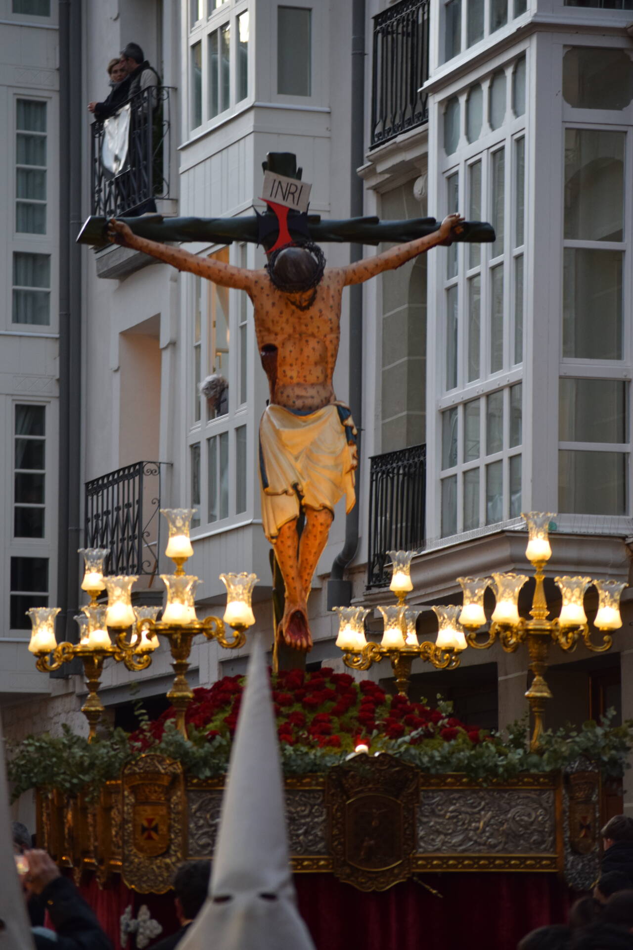 PASO: Santísimo Cristo de Burgos, conocido también como «Cristo de las Santas Gotas» (De autor anónimo, siglo XIII, custodiado en la iglesia de San Gil Abad), portado por los costaleros de la Hermandad.