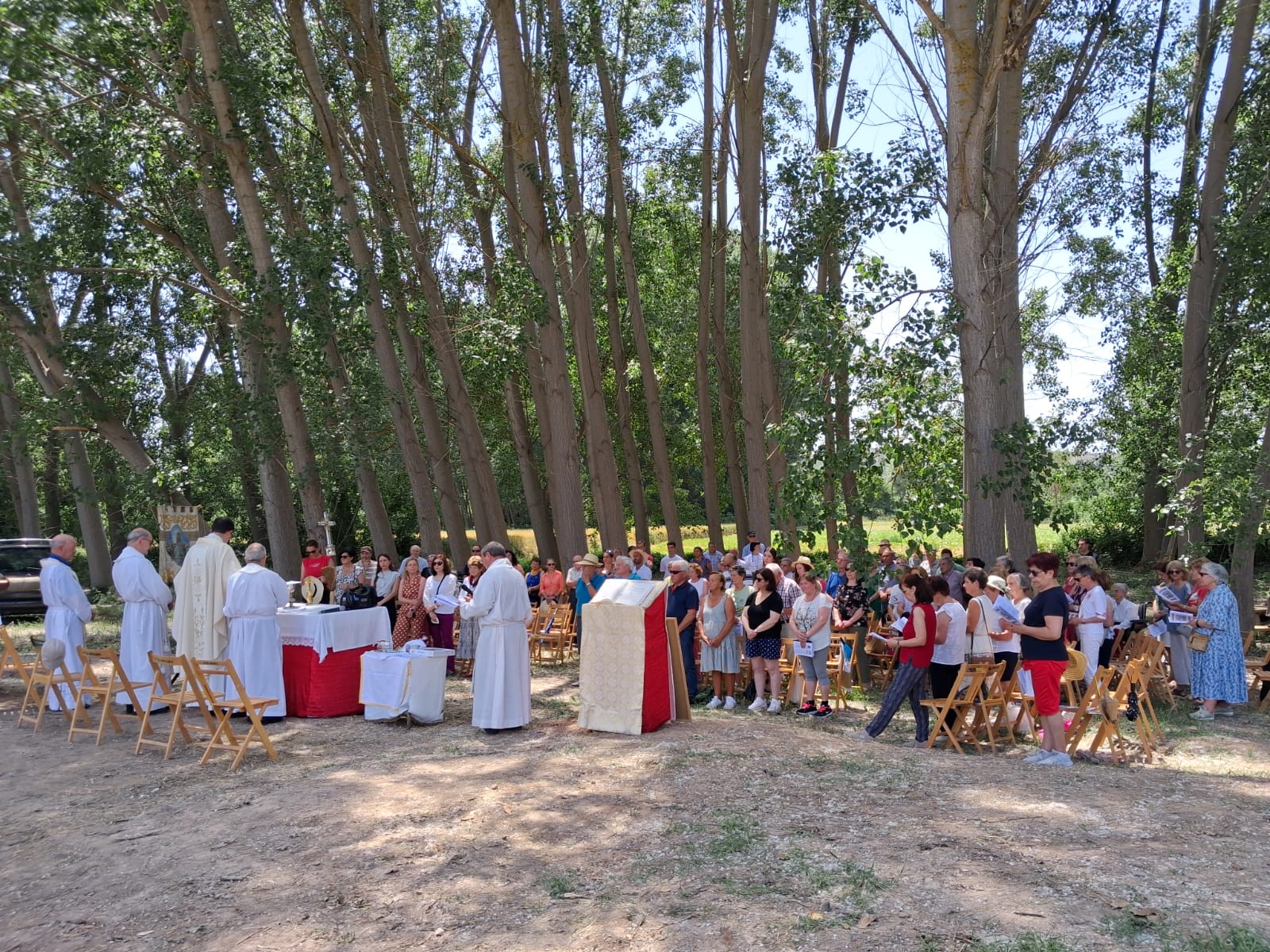 La mañana se desarrolló como estaba prevista, comenzando por el traslado de la imagen de la Virgen en procesión desde su original ermita rupestre hasta la arboleda cercana, donde se celebró la Eucaristía. Acompañado por varios sacerdotes de la comarca, presidió la misa el arcipreste, Francisco Javier Valdivieso, quien animó a los participantes a salir al encuentro de otras personas y realidades, como hizo María, cuando salió de su casa y se puso en camino para ayudar a su prima Isabel.