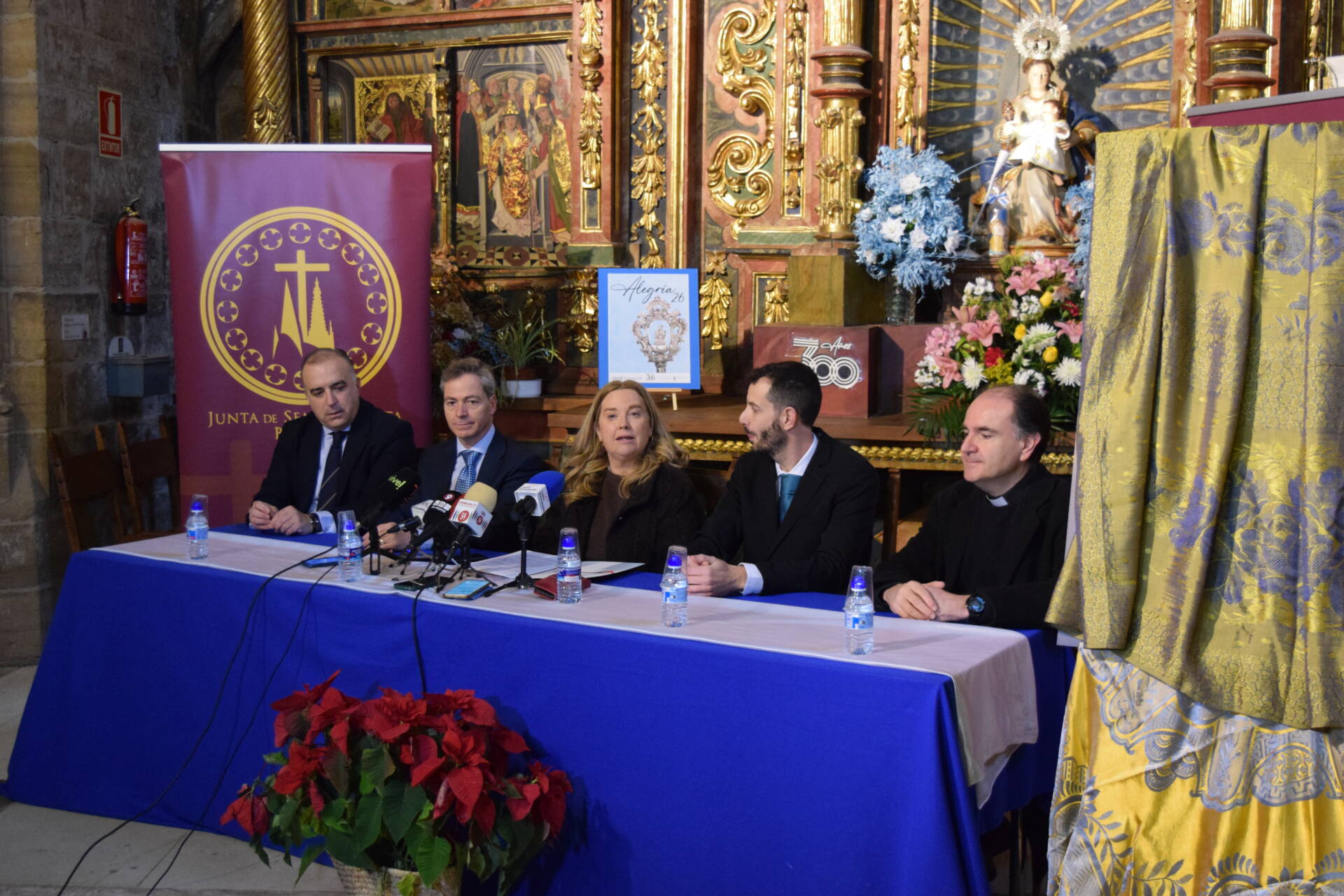 La iglesia de San Nicolás ha acogido esta mañana la presentación oficial del cartel de la Semana Santa de Burgos 2026, en un acto que ha contado con la participación de la alcaldesa de Burgos, Cristina Ayala; el presidente de la Junta de Semana Santa, José Juan Jiménez; y el abad de la Junta, Agustín Burgos. El cartel conmemora el 300 aniversario de la cofradía de la Virgen de la Alegría y representa uno de los momentos más reconocibles de la Semana Santa burgalesa: el encuentro del Domingo de Resurrección entre la Virgen de la Alegría y Cristo Resucitado en la plaza de Santa María.